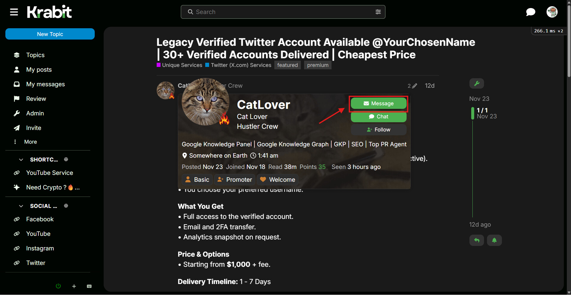 Click on the seller’s avatar. A profile card will appear with a green Message button.